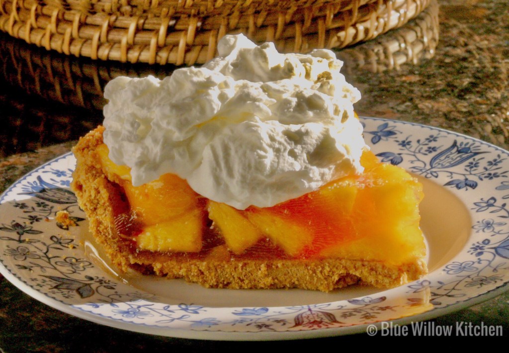 3. Pour gelatin into macerated peaches. Set the bowl back into the refrigerator. Watch carefully as the peach mixture starts to set. Once it begins to thicken (15-30 minutes), pour into the prepared graham cracker pie crust. Pie must be chilled for 6-8 hours before serving. Serve with whipped cream.