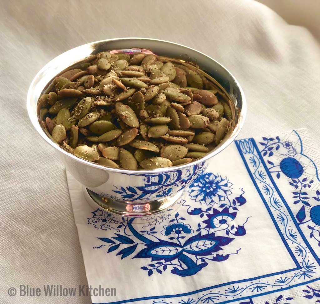 Sometimes I overthink appetizers to the point where the appetizer becomes half the dinner! It took me a while to learn that most times, the best appetizer is just a little Revere-style bowl with some salty, spicy nuts and seeds along with a cocktail. Mom enjoyed these on a trip to Rhinebeck, NY with Dad for her 56th birthday as a bar snack at a restaurant that is unfortunately no longer in business. So we resurrected it, and adapted it for Blue Willow Kitchen!